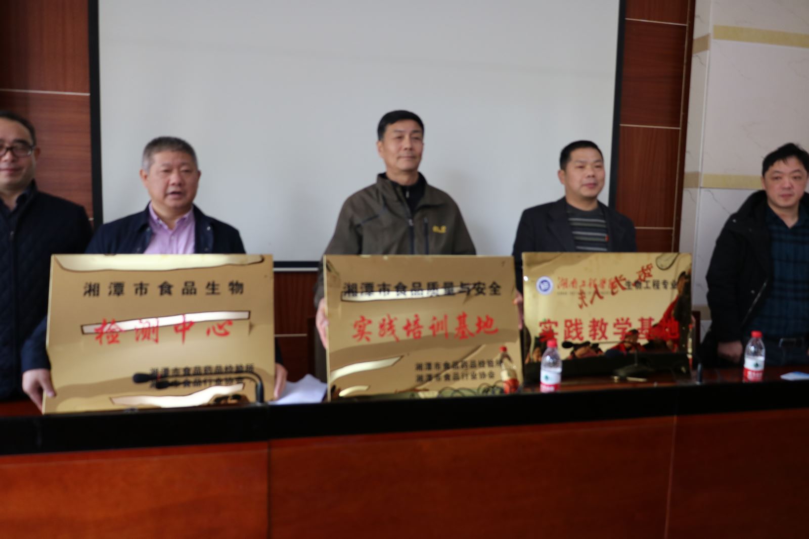 为响应国家关于加强公司和企业合作的号召,充分发挥公司与企业双方优势,beats365与湘潭市食品生产企业校企合作签约及挂牌仪式举行,其中,湘潭市食品药品监督管理局副书记宋树平、检验所副所长孙映球、市食品行业协会会长王建伟以及化学化工公司经理邓继勇、党总支书记胡爱钦、副经理张何、生物工程教研室主任张儒及相关部门负责人共同出席了此次签约、揭牌仪式。