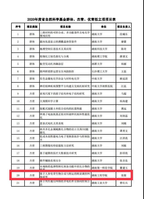 近日,“2020年度省自然科学基金群体、杰青、优青拟立项项目”公示,公司张儒老师获批湖南省杰出青年基金,其项目为“基于人参皂生物合成与转运的转录调控网络研究”,这是公司首次有人获评,也是公司首位获得该基金的教师。