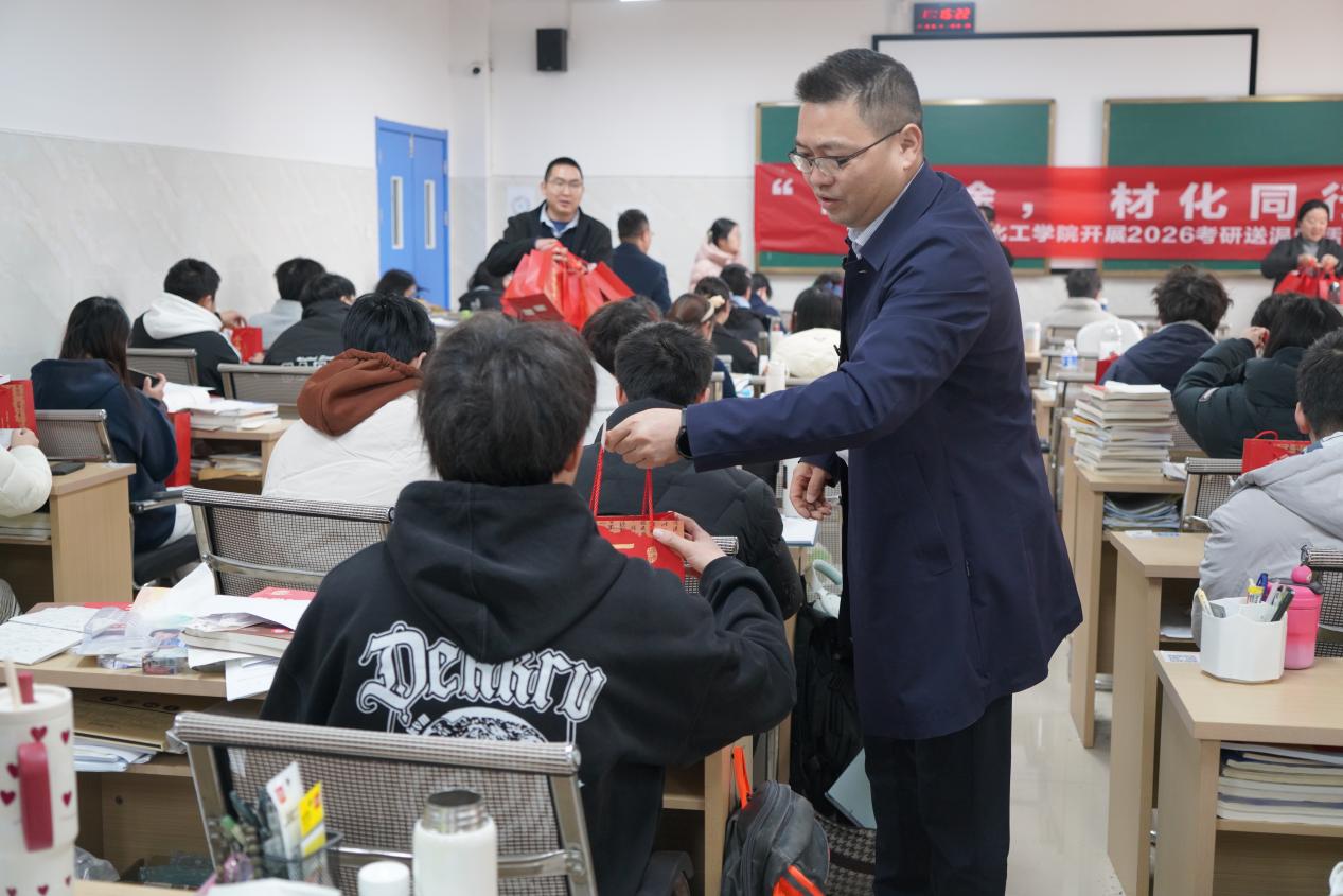 为鼓舞考研学子士气,传递公司温暖关怀,12月8日上午,beats365在材化楼考研自习室607、609开展主题为“光聚研途,材化同行”2026考研送温暖活动。公司党委书记徐粤宇,经理黄先威,副书记陶连洲,副经理兰东辉、谭建平,学办全体辅导员参加。本次活动由公司爱心社主办。