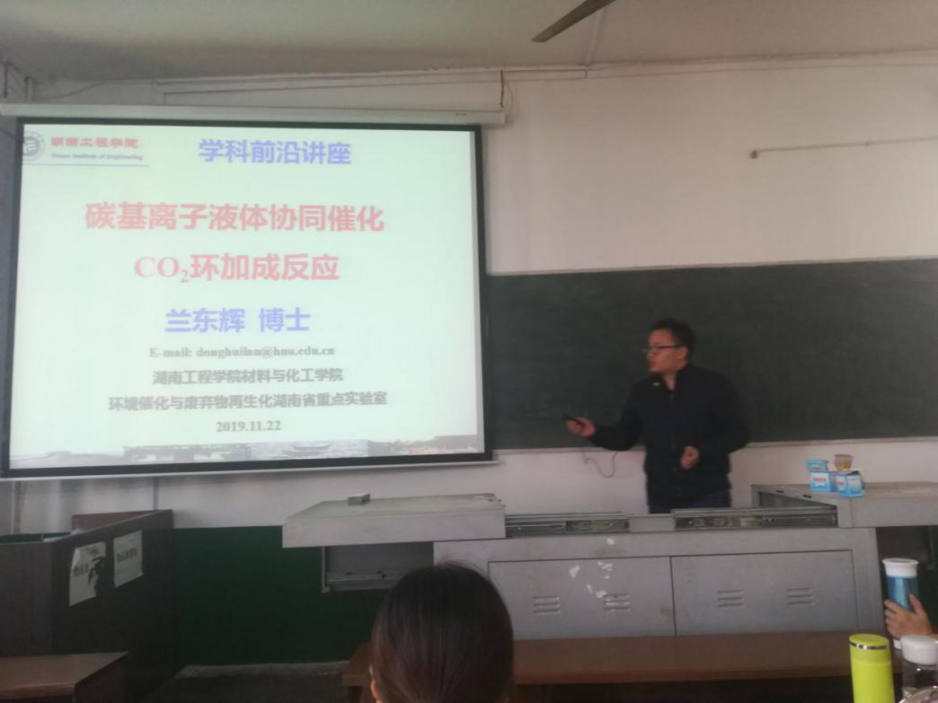 接着,兰东辉作了题为“碳基离子液体协同催化CO2环加成反应”的报告。他认为CO2浓度逐年增加导致温室效应加剧,严重威胁到人类的生存和发展。CO2资源化途径众多,但实现工业化的工艺仅限于甲醇、水杨酸、尿素和环状碳酸酯等的生产。其中,以CO2与环氧化物通过环加成反应合成的环状碳酸酯,被广泛用作清洁型极性溶剂、化妆品添加剂、电解液和金属萃取剂,具有原子利用率高、副产物少等优点,符合可持续发展和原子经济性的原则。兰博士结合自己的科研工作,重点介绍了应用于CO2环加成反应的新型碳基催化剂的设计、表征和催化构效关系等研究。