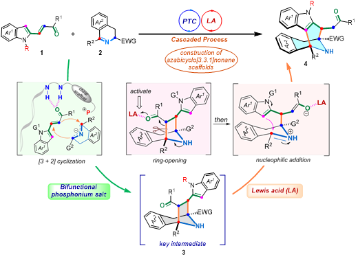 中(大)环骨架分子的构筑一直是现代有机合成中的重要挑战,而恰恰这类结构是众多药物及其中间体的核心结构单元。氮杂八元桥环是一类独特的吲哚生物碱结构单元,研究表明该类骨架衍生物具有重要的抗癌、抗抑郁和镇静等作用。早期人们是从稀有的天然植物和海洋生物中提取,但这远远不能满足现实需要。因此,发展该类骨架分子的合成方法学具有重要的研究意义。基于以上背景,首次利用双功能季鏻盐和路易斯酸接力催化,通过“串联环化/开环/扩环”的策略,高收率和高立体选择性的得到了具有挑战性的氮杂八元桥环分子。该研究方法为结构复杂的手性八元桥杂环分子的合成开辟了新的思路,同时为小分子抗癌药物筛选提供了新的机会,具有重要的合成价值和研究意义。