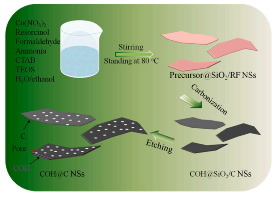 锂离子电池作为新能源汽车中电动汽车的核心技术,具有能量密度高、寿命长、自放电率低、比功率高等优点。但随着科学技术的不断进步,人们对于性能要求也越来越高,因此大力发展更高能量密度和更长循环寿命的锂离子电池对缓解我国能源紧缺问题有着重要战略意义。相较于石墨,CoOOH/Co(OH)2负极材料具有更高的理论比容量,但其在循环过程中较大的体积变化会造成容量的快速衰减。该工作通过正硅酸四乙酯辅助合成碳包覆超薄多孔CoOOH/Co(OH)2杂化纳米片(COH@CNSs),实现材料结构稳定性和电化学动力学的同步提升,最终电池在1000 mA g−1恒流测试下经历400次循环后可逆容量高达696.2 mA h g−1,具有较好的应用前景。