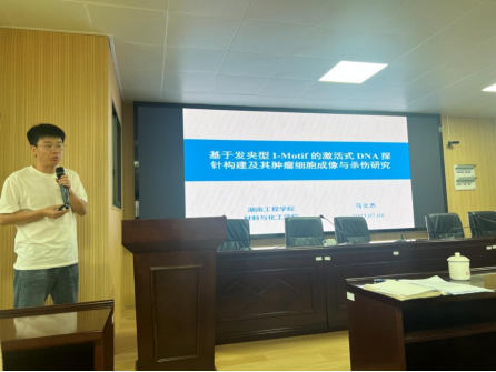 马文杰博士以“基于发夹型I-motif的激活式DNA探针构建及其肿瘤细胞成像与杀伤研究”为题,介绍了恶性肿瘤对人类生命健康的危害以及传统的肿瘤诊疗一体化探针构建方法及其在肿瘤诊疗应用中遇到的困难和挑战,进一步引出基于肿瘤微环境响应的激活式诊疗探针构建策略,着重围绕基于肿瘤酸性微环境响应的智能DNA纳米探针构建及其在肿瘤细胞成像与杀伤中的应用研究展开,详细介绍了博士期间在肿瘤诊疗应用中的研究工作进展和今后的研究方向。