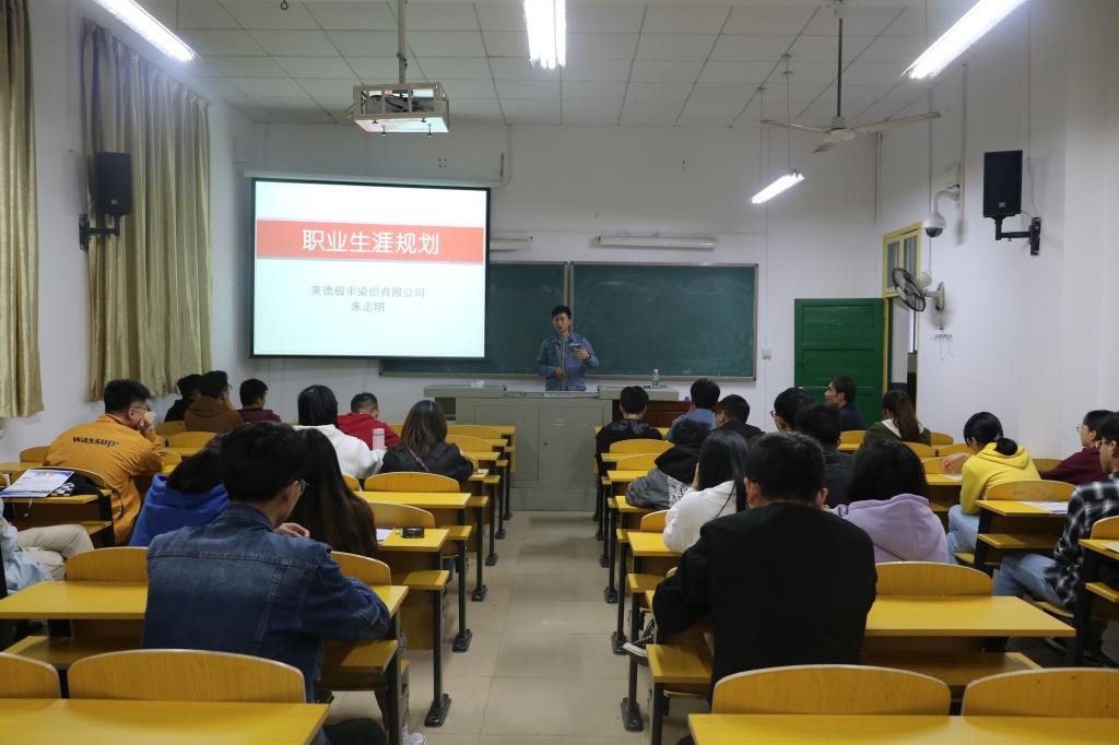 2019年11月15日晚,beats365邀请公司优秀员工英德极丰染织有限公司主管朱志明在红楼102举行了一场创新创业经验分享会,轻化工程专业老师及员工20余人参加。
