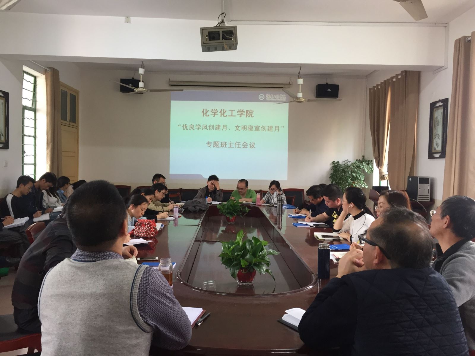4月27日下午,化学化工公司在四教306召开了以“优良学风建设月、文明寝室创建月”为主题的班主任工作会议,经理邓继勇、党总支书记胡爱钦、党总支副书记张建国、全体辅导员及班主任参加了本次会议,会议由学办主任吴菲主持。