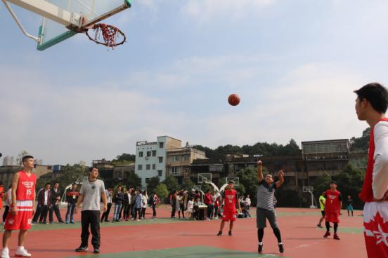 主裁判将球在双方跳球选手之间抛起,比赛开始!篮球被身披红色战袍的院篮球队队员抢到,紧接着,持球队员便以一个凌厉的快攻率先拿下一球,比赛现场顿时沸腾起来,院篮球队也士气大增。然而教师队并没有被对手的气势压制,在之后院篮球队的一次进攻中,教师队把握住机会,成功抢断对方的传球,完成了一次完美的防守反击,扳回一城。