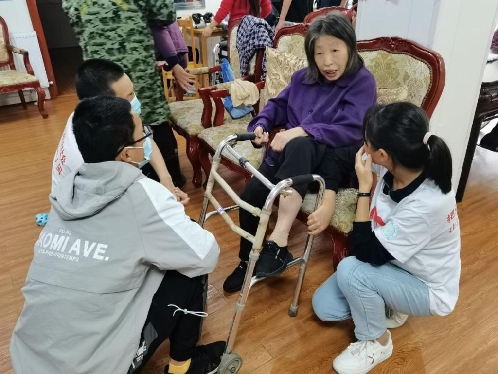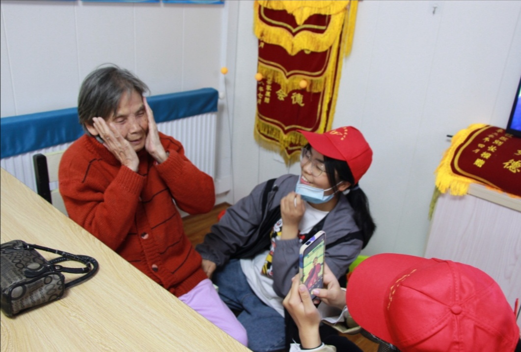 活动总有几个画面让人难以忘怀。有位老奶奶和我们讲起她年轻时学习工作的故事,对比社会的改更,只见奶奶开心得合不拢嘴,双手激动地不停比划,眉毛弯着,眼睛里焕发出熠熠光彩;志愿者们则围坐在她的身边,入神地听着她讲故事,一股温情油然而生。还有一位奶奶在志愿者握着手倾听她的诉说,并且和她谈心交流后,仿佛忘记了腿上的病痛,面对镜头也开心地跟着我们志愿者小姐姐一起摆起了姿势,这是我们这次活动最大的收获。