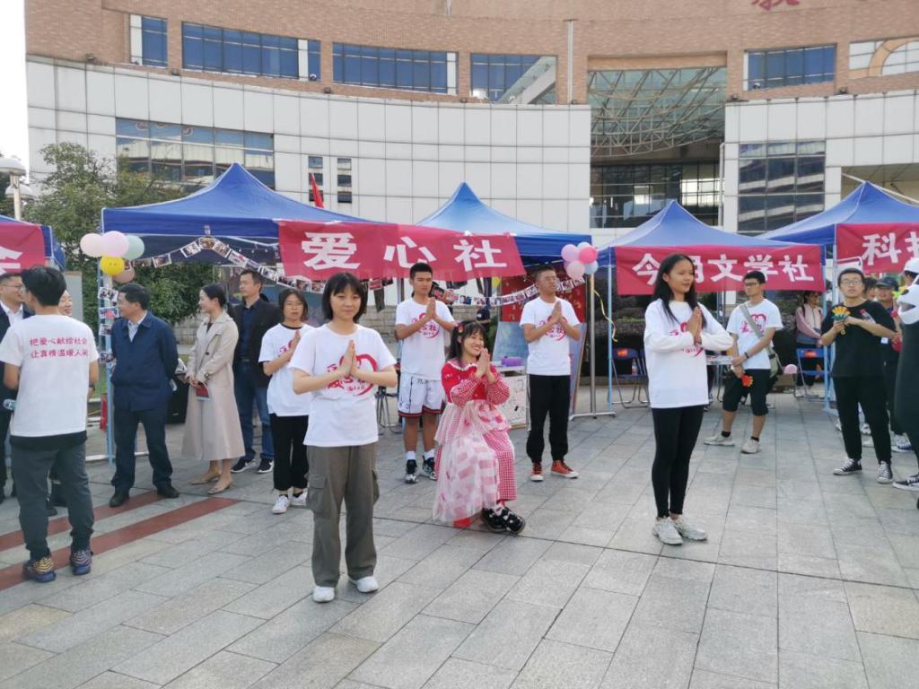 11月10日下午,“高举团旗跟党走 奉献青春创佳绩”2020年校园文化暨社团文化艺术节开幕式举行。爱心社在知行广场的社团嘉年华展示区开设一个区域,展示了爱心社建社的历史、主要志愿服务活动、所取得的主要成绩的照片,并布置了旧物回收、爱心捐款、爱心义卖专区,同学们表演了“感恩的心”手语操,现场反响热烈。