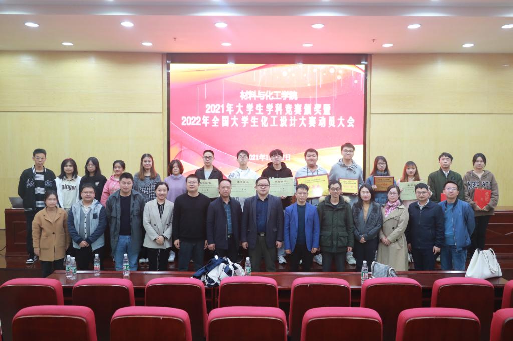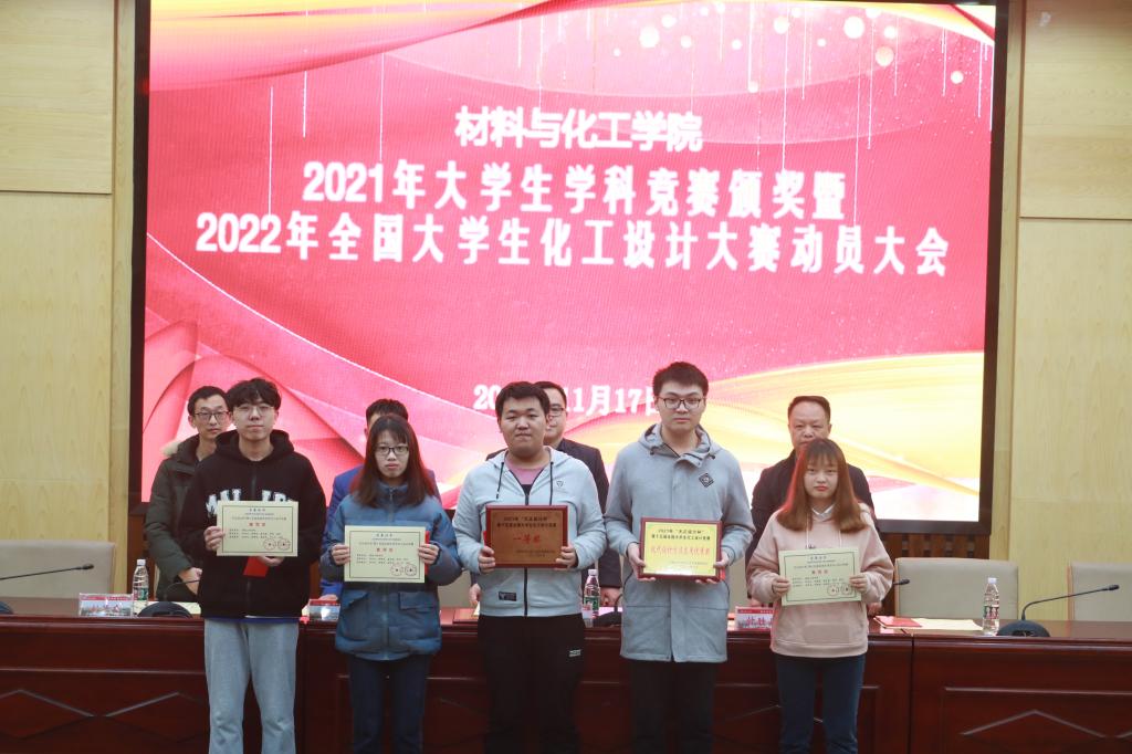 张儒宣读了获奖名单,在场的领导嘉宾为在第十五届全国老员工化工设计竞赛、第三届全国老员工绿色染整科技创新竞赛、湖南省第十一届老员工化学化工实验与创新设计竞赛、第十四届挑战杯湖南省老员工课外学术科技作品竞赛、湖南省第十三届老员工课外化学化工类创新作品竞赛、2021年“互联网+”等赛事中获得优异成绩的团队及个人颁发证书。付胜兵为全国老员工化工设计竞赛获奖团队颁发赞助奖金。