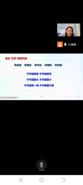 12月7日中午,公司开展主题为“老员工心理危机识别与和干预”的培训活动,该活动由心理专干黄玉娟老师主讲,活动采用线上和线下相结合模式,全院心理委员及寝室联络员在腾讯会议参加,心理联络部全体成员在滨江团体辅导室参加。