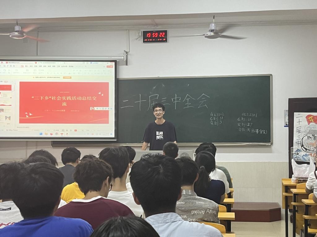 活动伊始,化工2202班团支书带领同学们一同了解中国共产党第二十届三中全会,从会议的背景到重要决策,从宏观的国家发展规划到对青年的期望,她的讲解循序渐进,让同学们对党的二十届三中全会有了更深刻的认识,也凸显了青年人在新时代背景下的责任与使命。她说:“我们应当积极参与社会实践,将所学知识运用到实际中,为家乡的发展贡献自己的力量”。