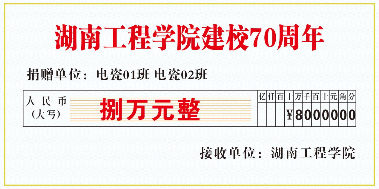 值此母校建校七十周年之际,电瓷8901、9002班同学怀感恩之心,尽绵薄之力,向母校捐赠8万元,用于新化工大楼学术报告厅建设,希望母校学术交流蔚然成风。