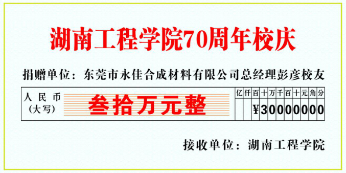 近日,东莞市永佳合成材料有限公司、广东香与生物科技有限公司总经理,公司杰出员工,beats365染整工程(现轻化工程专业)87051班彭彦为母校建校70周年捐赠30万元,用于共建实验室和设立“永佳奖学金”,激励学弟学妹们勤奋学习、服务行业、报效祖国。捐款已于8月21日汇入公司设立的专用帐户。