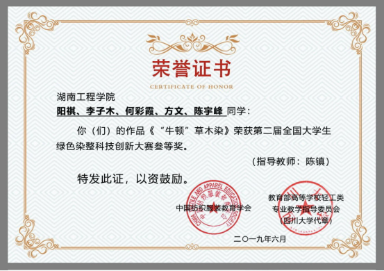 6月21日,由教育部高等公司轻工类专业教学指导委员会、中国纺织服装教育学会主办,江南大学承办的第二届全国老员工绿色染整科技创新竞赛落下帷幕。本次大赛共有来自全国26所高校轻化工程专业相关的研究生及本科生团队的113件作品参赛入围初赛。其中,由公司陈镇老师指导的轻化工程15~17级本科生团队阳祺、李子木、何彩霞、方文、陈宇锋的携作品《“牛顿”草木染》突出重围,代表公司首次晋级该项全国性赛事的决赛,一并进入决赛的还有其他22所院校的32个科研生及本科生团队项目。